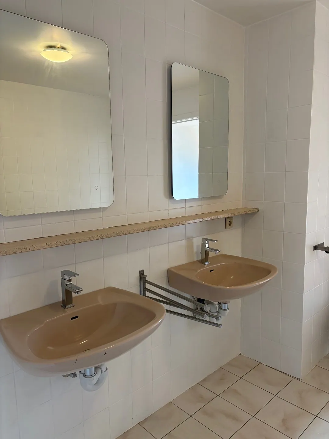 De badkamer is voorzien van een dubbele lavabo en een douche in bad.