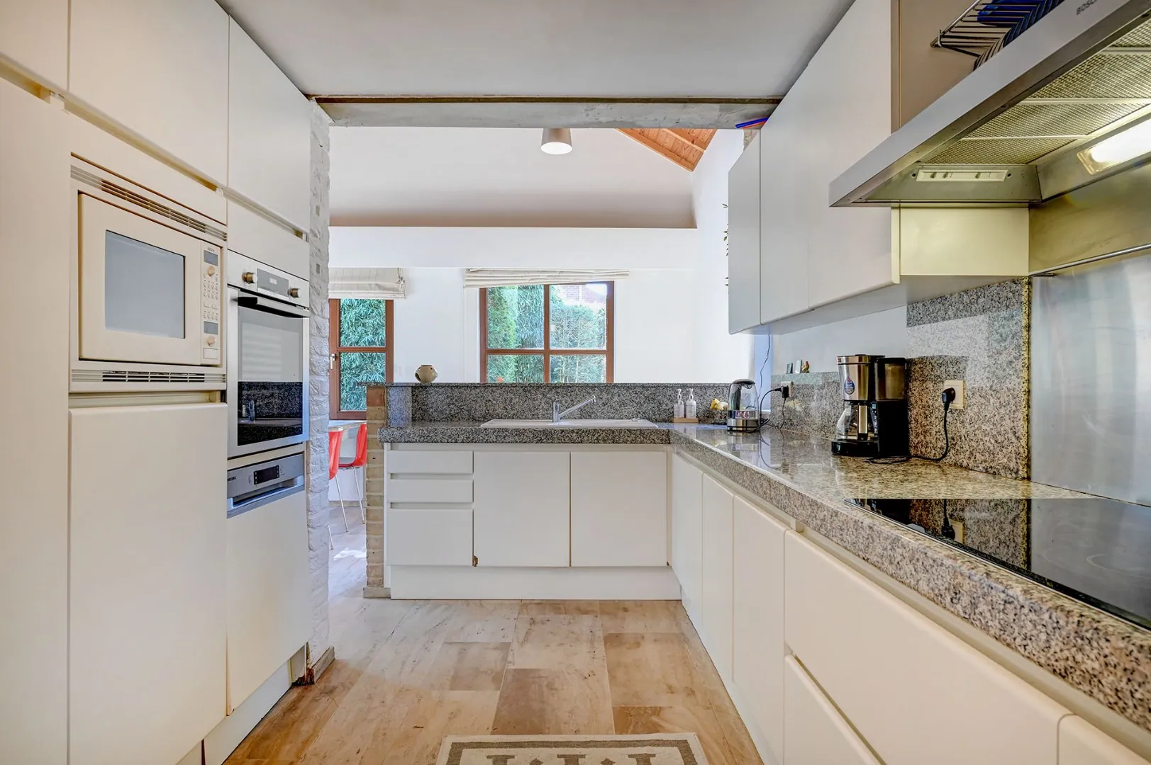 Aansluitend bevindt zich de villa, die garant staat voor rust en privacy. De woning beschikt over vier slaapkamers, perfect voor een gezin of om extra ruimtes in te richten als bureau, dressing of hobbykamer. De twee ruime leefruimtes bieden tal van mogelijkheden voor ontspanning en ontvangst, terwijl de volledig uitgeruste keuken en de badkamer alle comfort bieden die u nodig heeft in het dagelijkse leven.