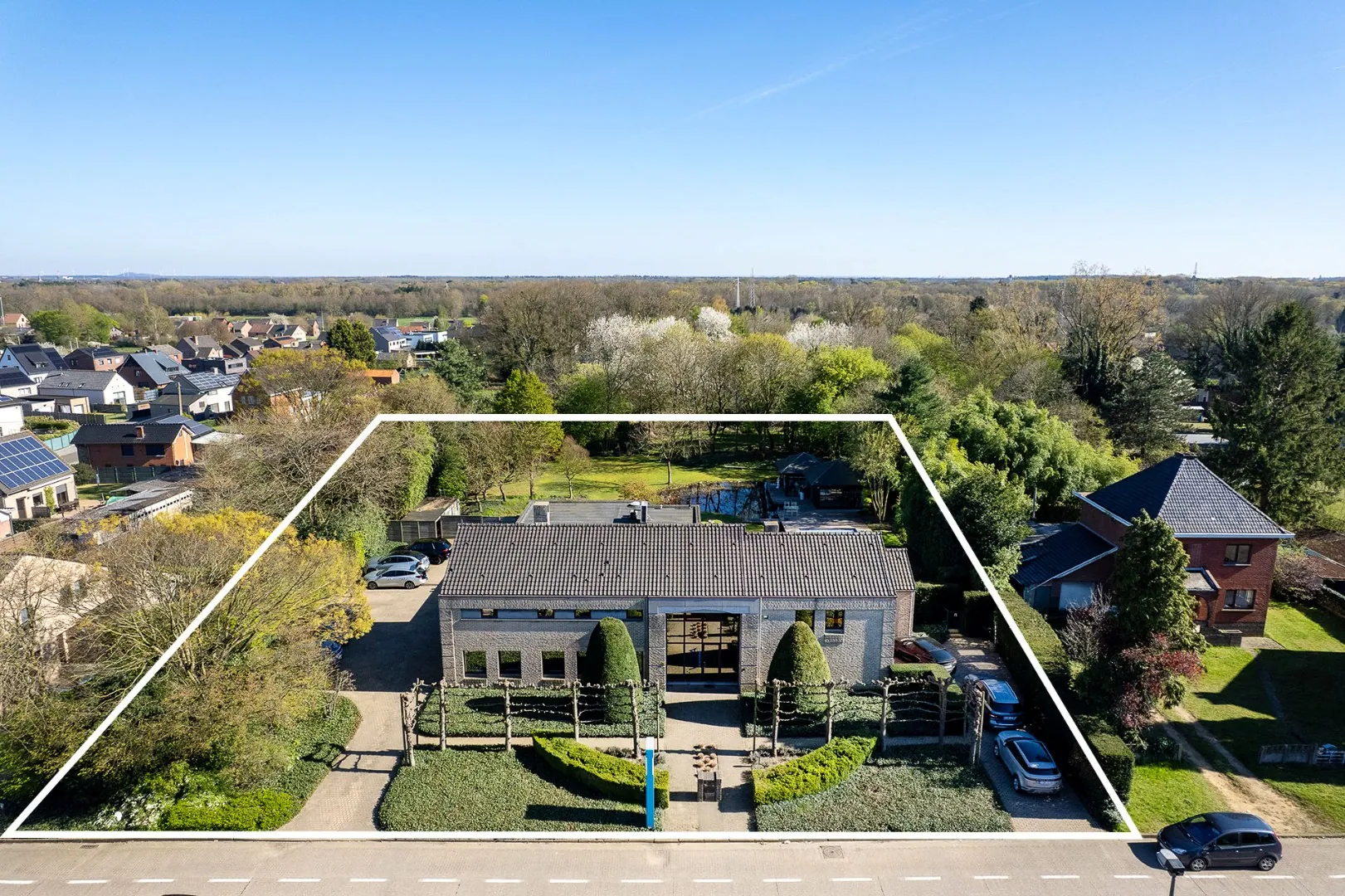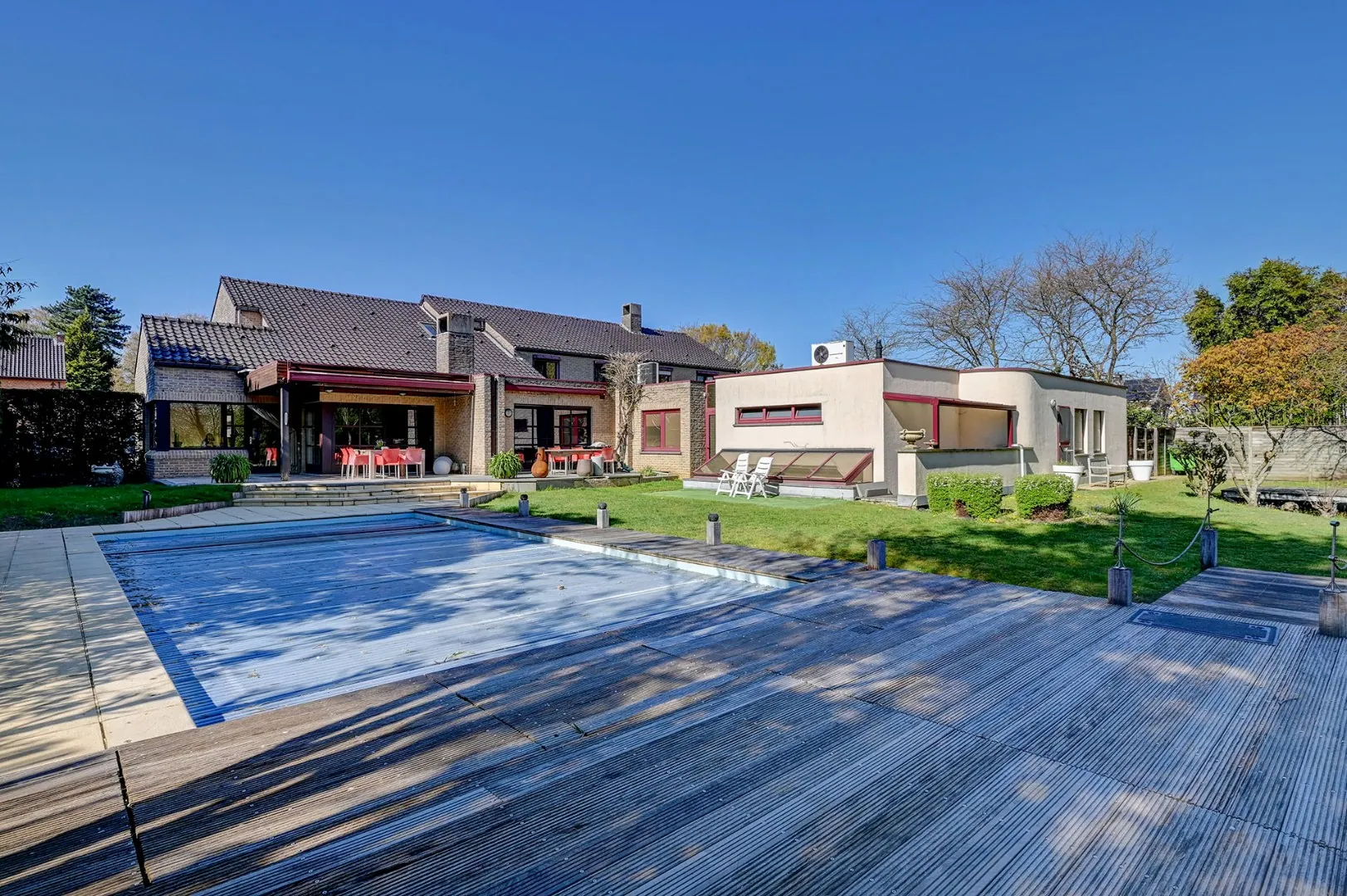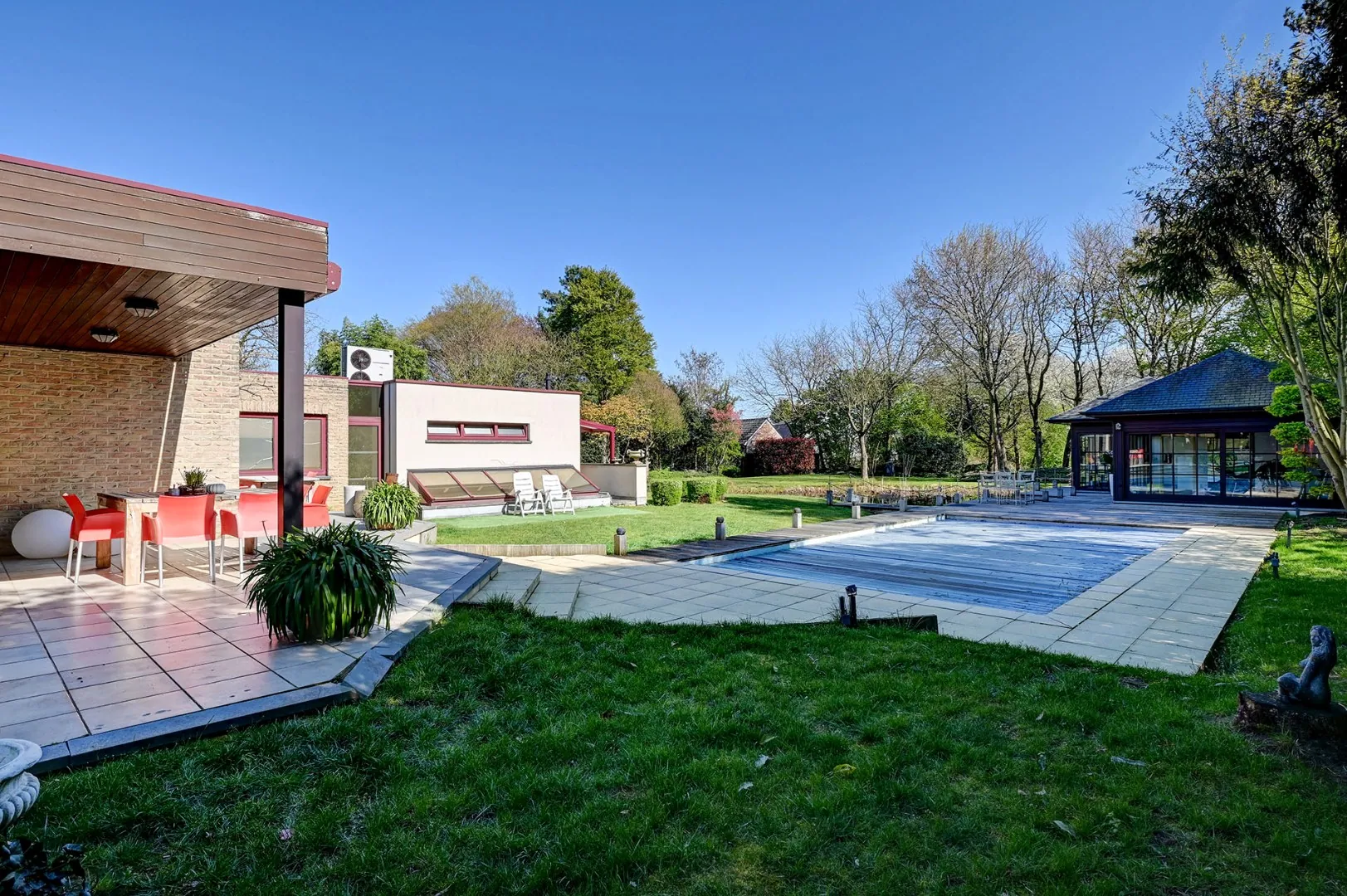 Buiten wordt het plaatje compleet gemaakt door een prachtig aangelegde tuin, hier vindt u een uitnodigend zwembad met een sfeervol paviljoen, ideaal voor zomerse dagen en gezellige avonden. Daarnaast zorgt de vijver voor een rustgevend en natuurlijk accent, waardoor u zich in een oase van groen waant.