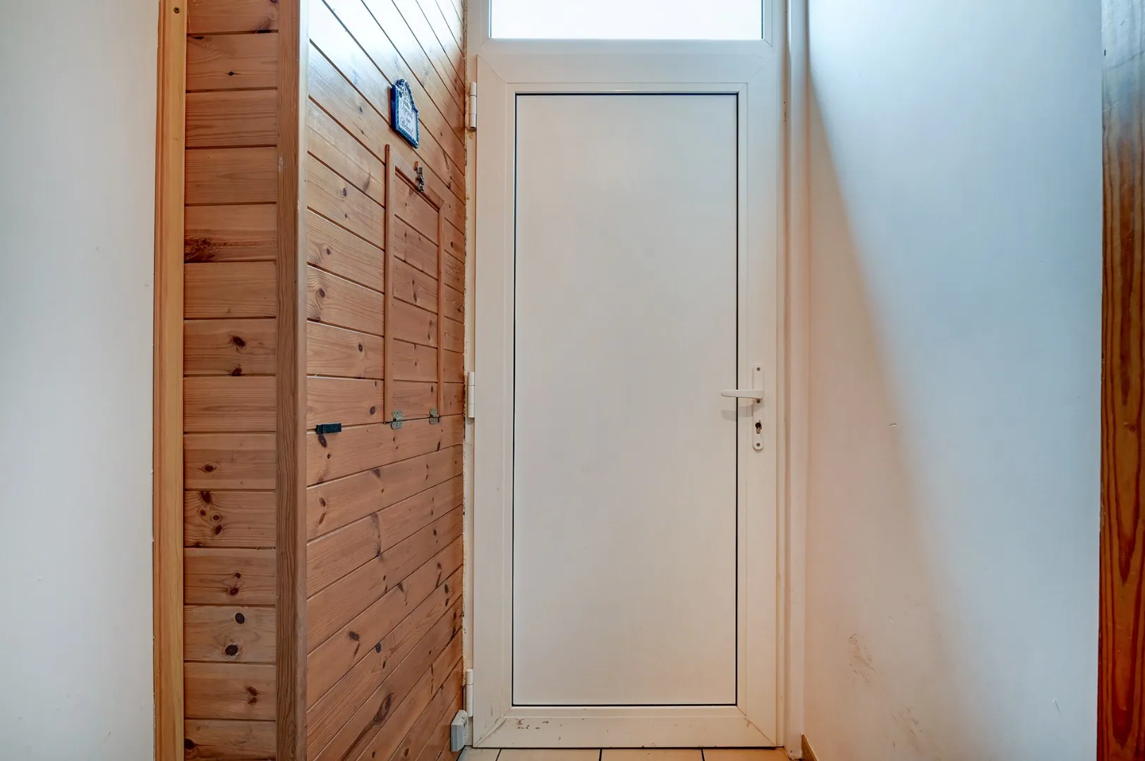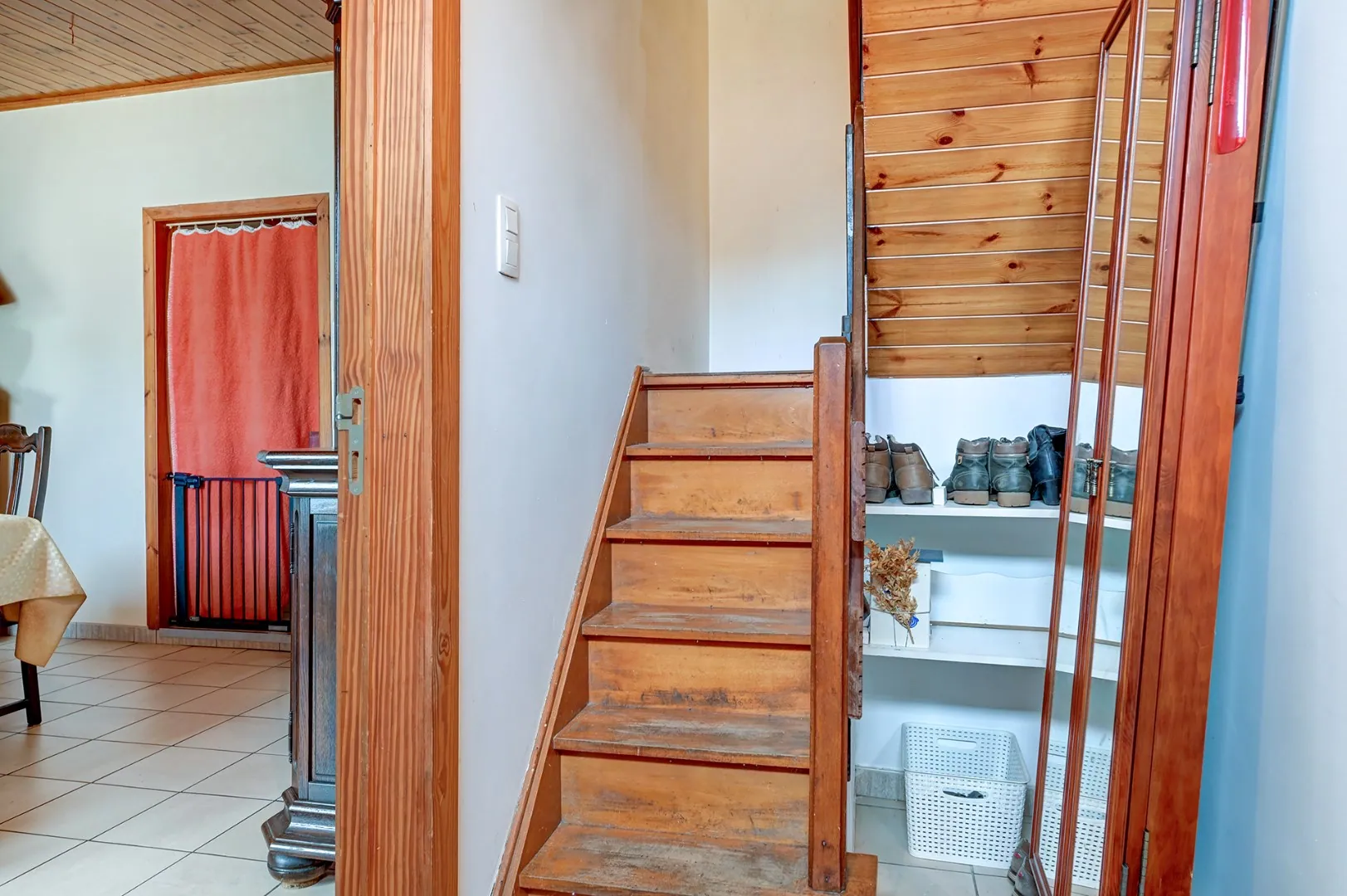 Het huis heeft op het gelijkvloers een inkomhal, een living, een tv-hoek en hierachter de keuken, badkamer en wasplaats.