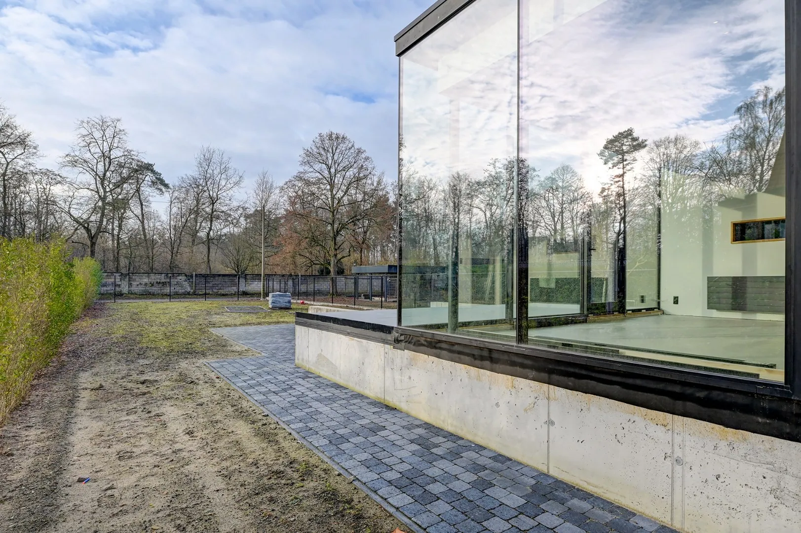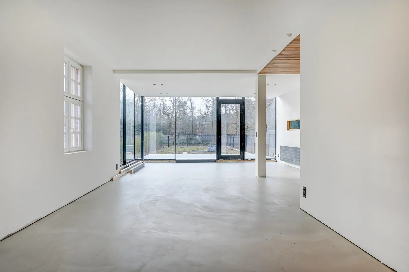De achtergevel van het gelijkvloers werd volledig vernieuwd met grote glaspartijen richting eetkamer en salon.