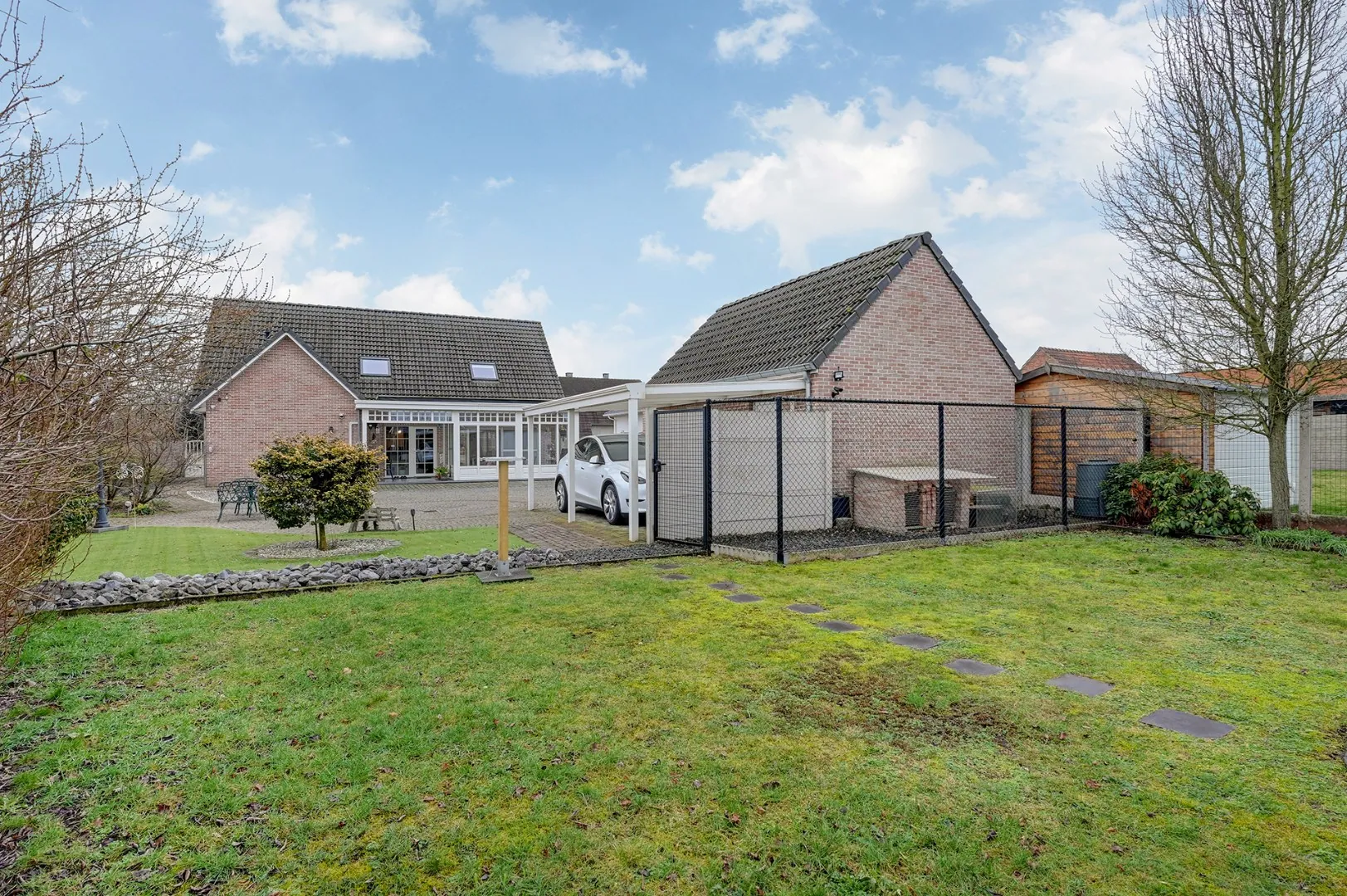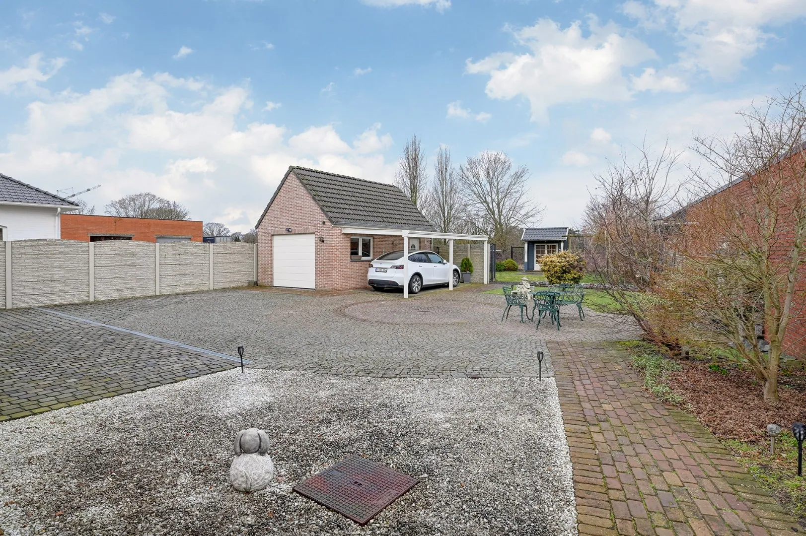 De auto's kunnen in de garage en/of onder de carport maar er zijn ook verschillende parkeerplaatsen rond het huis.