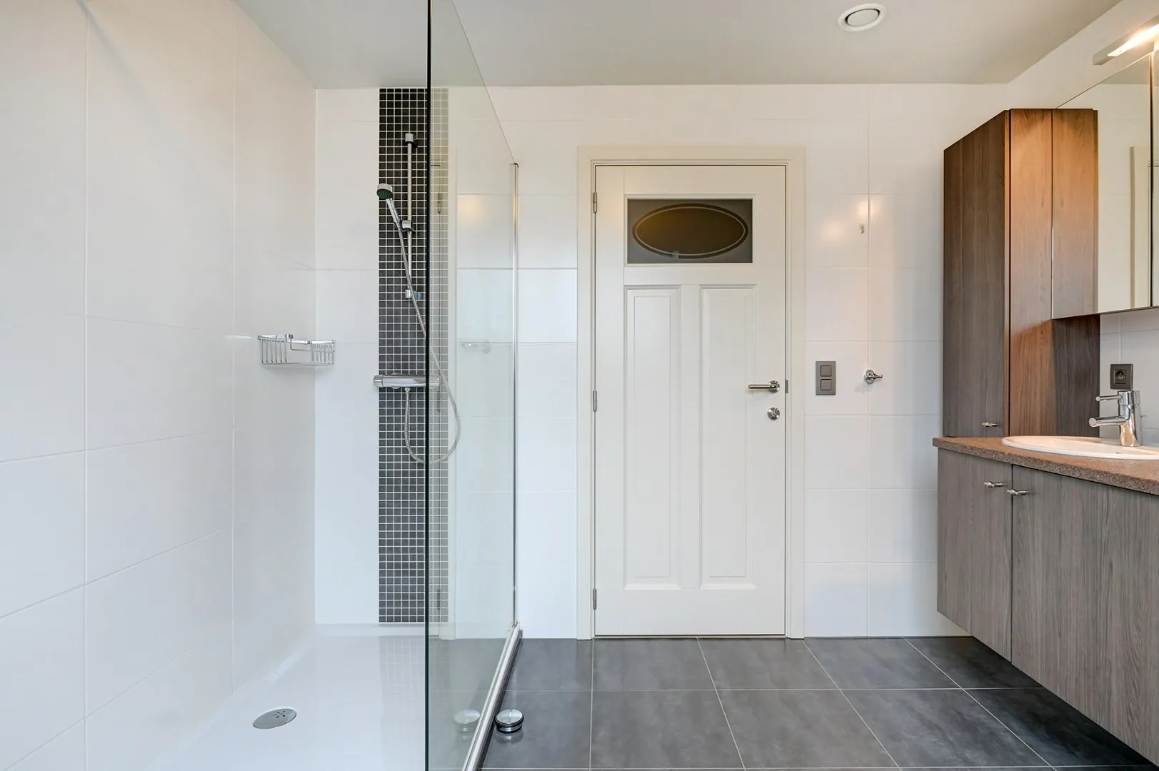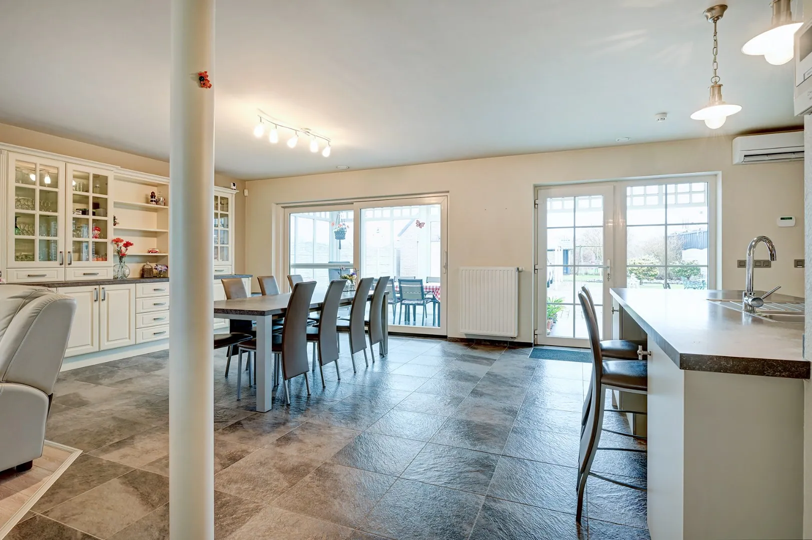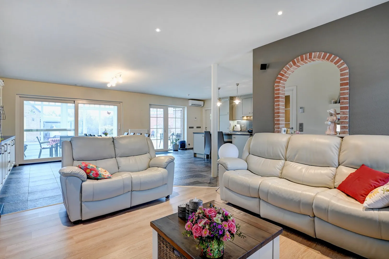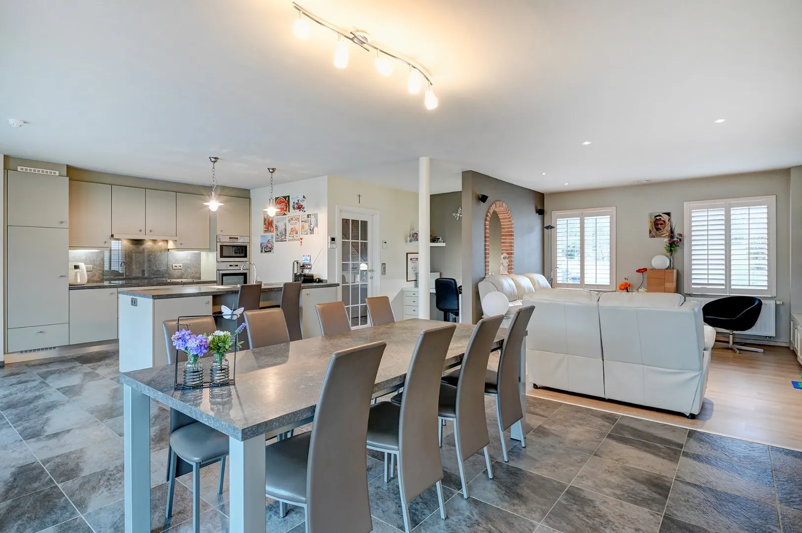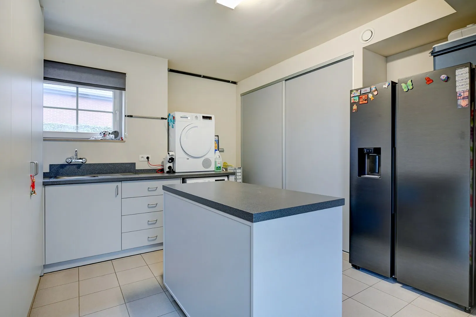 Op het gelijkvloers hebben we een leefruimte met open keuken, een bijkeuken/wasplaats, een veranda met een mooi zicht op de tuin en een slaapkamer met dressing en badkamer ensuite.