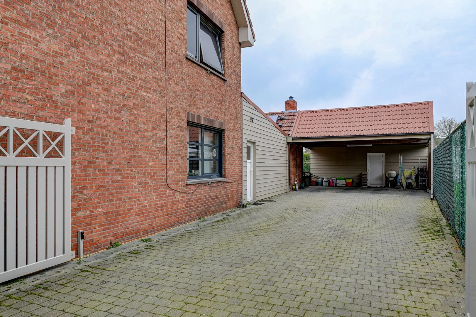 Op het einde van de inrit kunnen er twee auto's onder de carport en hierachter is nog een grote tuinberging.