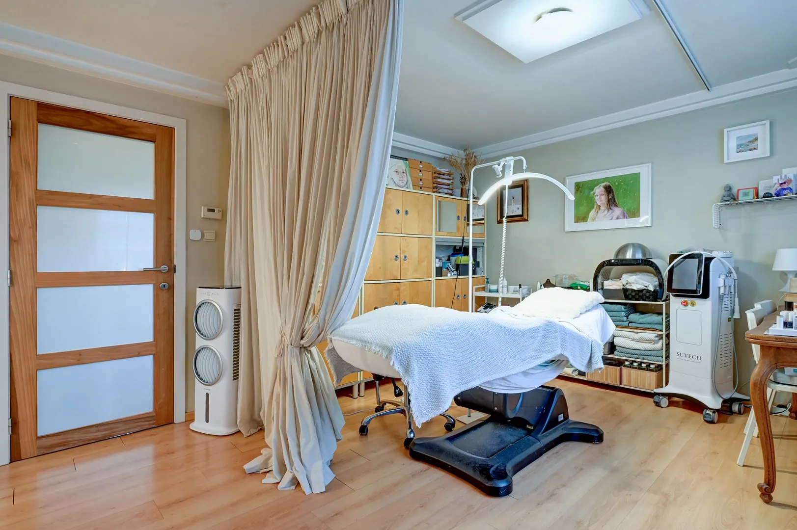 Op het gelijkvloers zijn er twee leefruimtes, eentje is nu ingericht als schoonheidssalon maar kan perfect dienen als living met eetkamer, hiernaast is de volledig ingerichte keuken (2007) en hierachter is er nog een grote ruimte waar nu een tv-hoek en een eetkamer zijn ingericht.