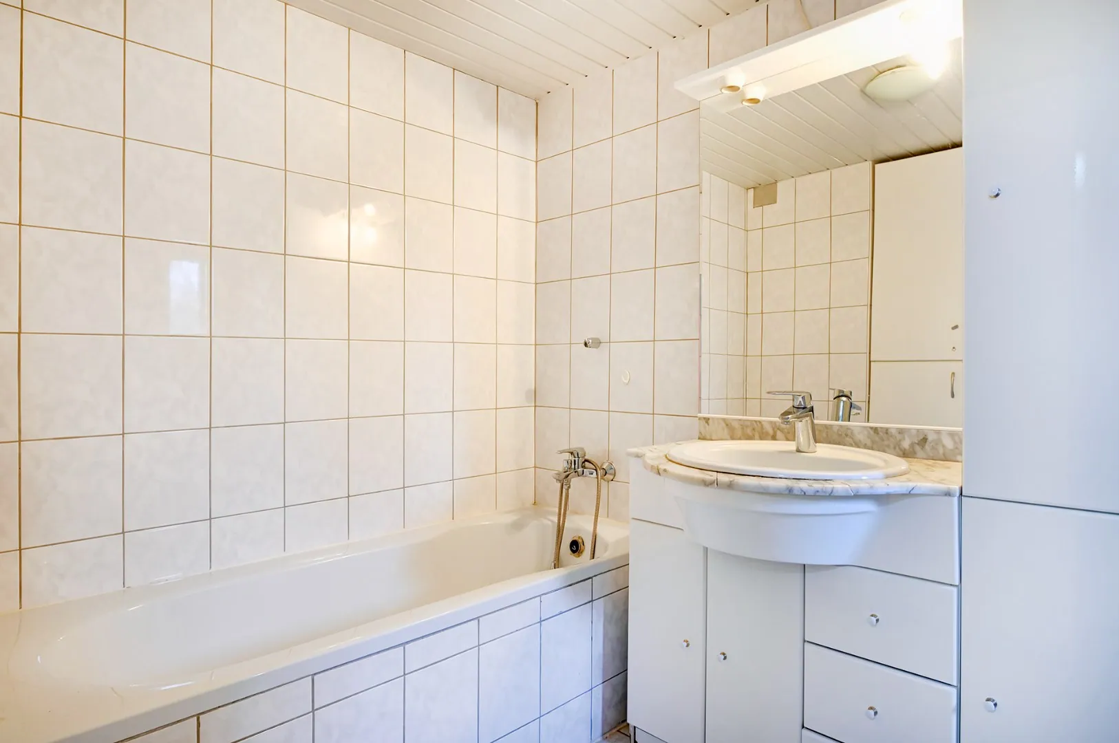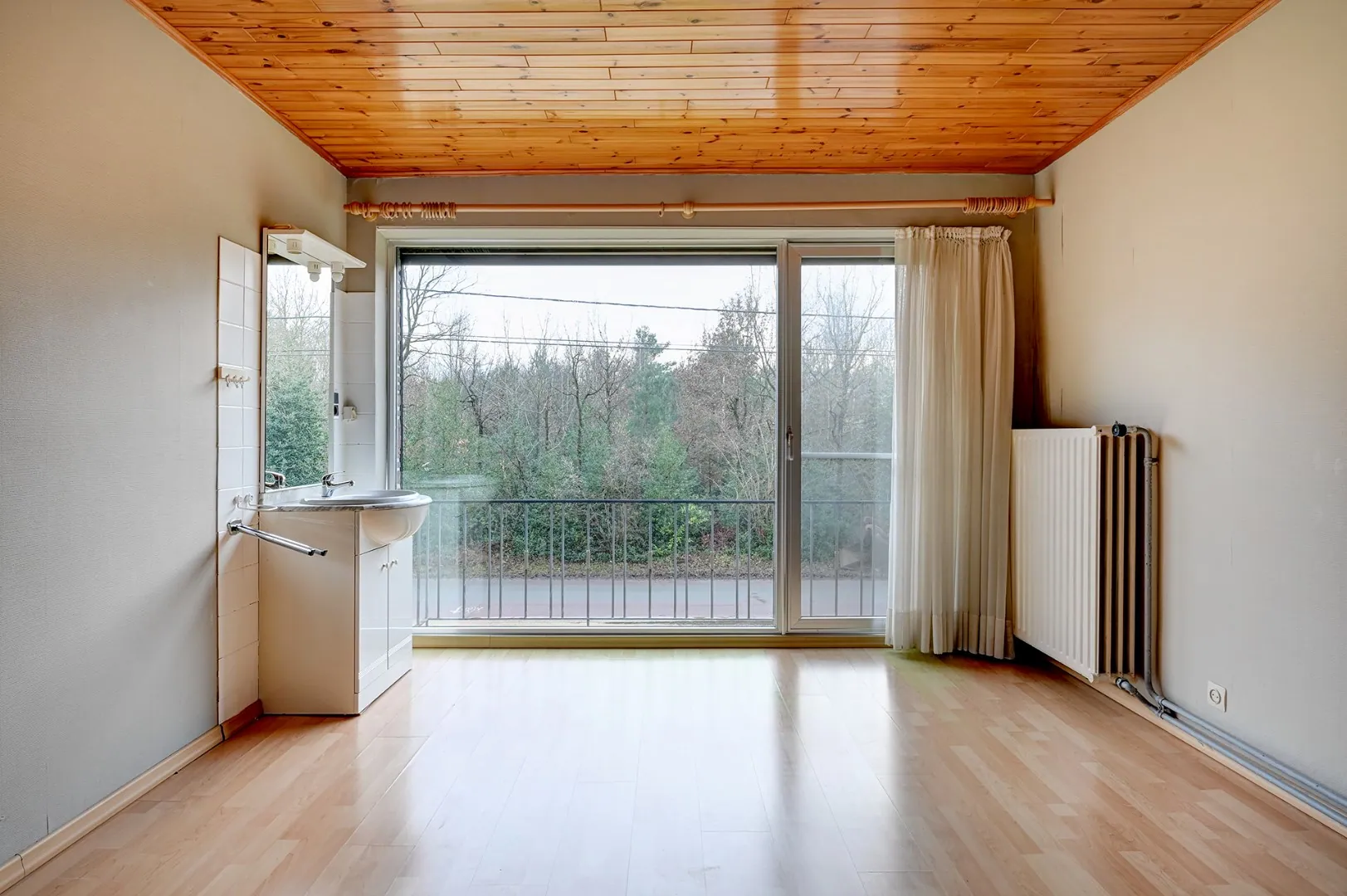 Het huis, rustig gelegen pal tegenover het Sint-Jansbosje, heeft op het gelijkvloers een mooie leefruimte en een ruime keuken, een bureau, een apart toilet, een badkamer met bad en douche en een wasplaats.