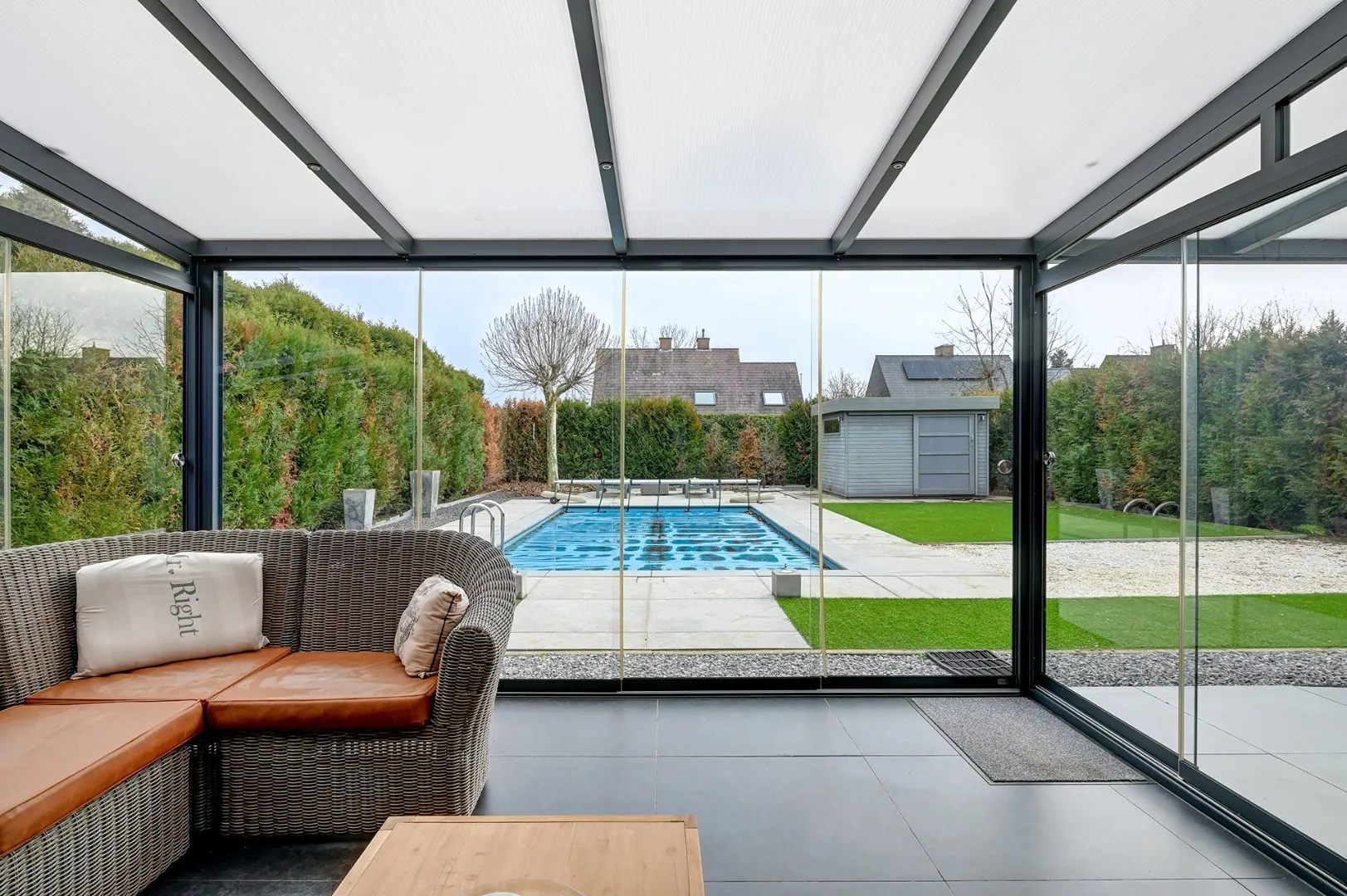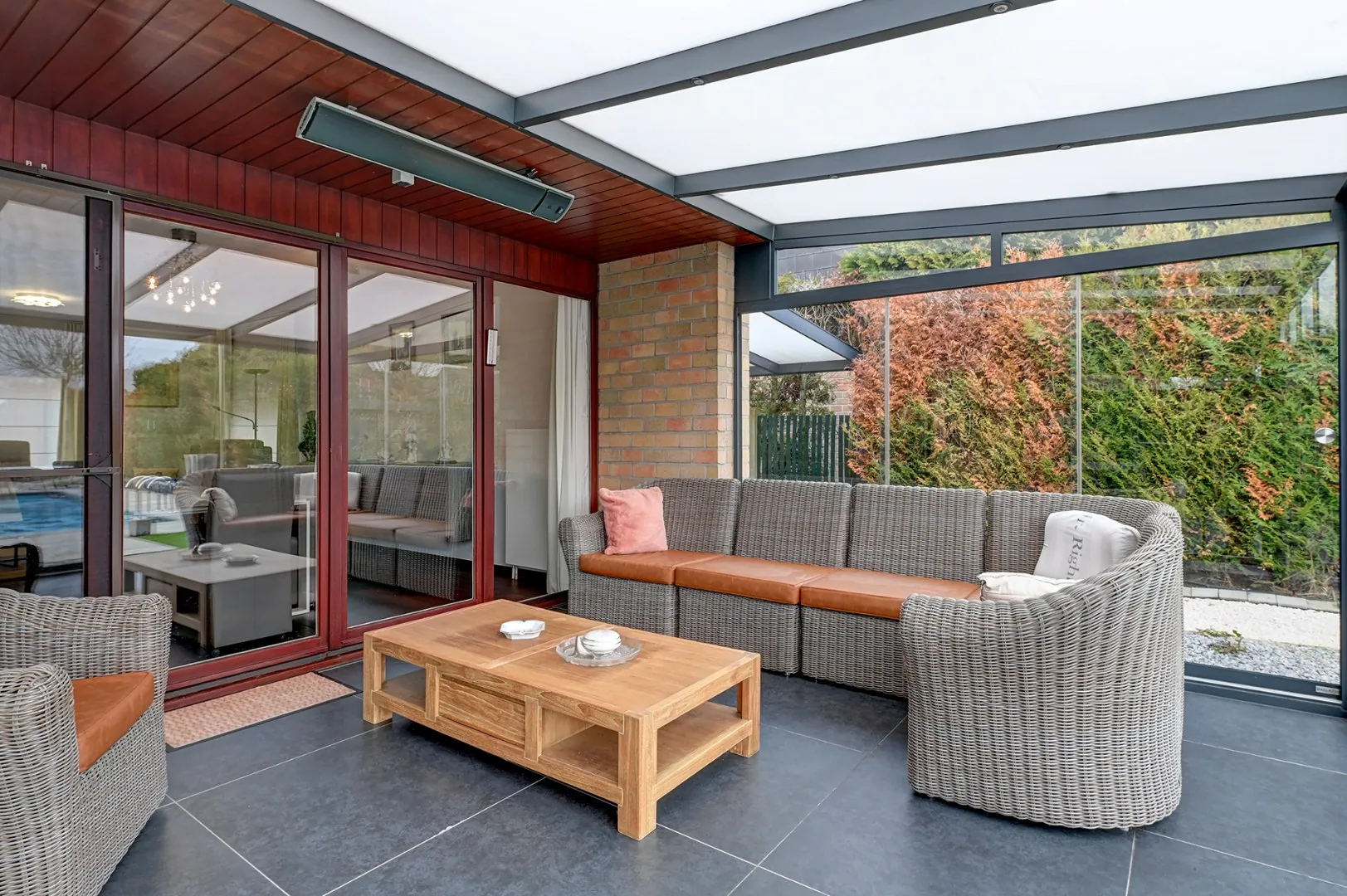 De tuinkamer heeft glazen schuifwanden en dimbare led-verlichting met afstandsbediening.