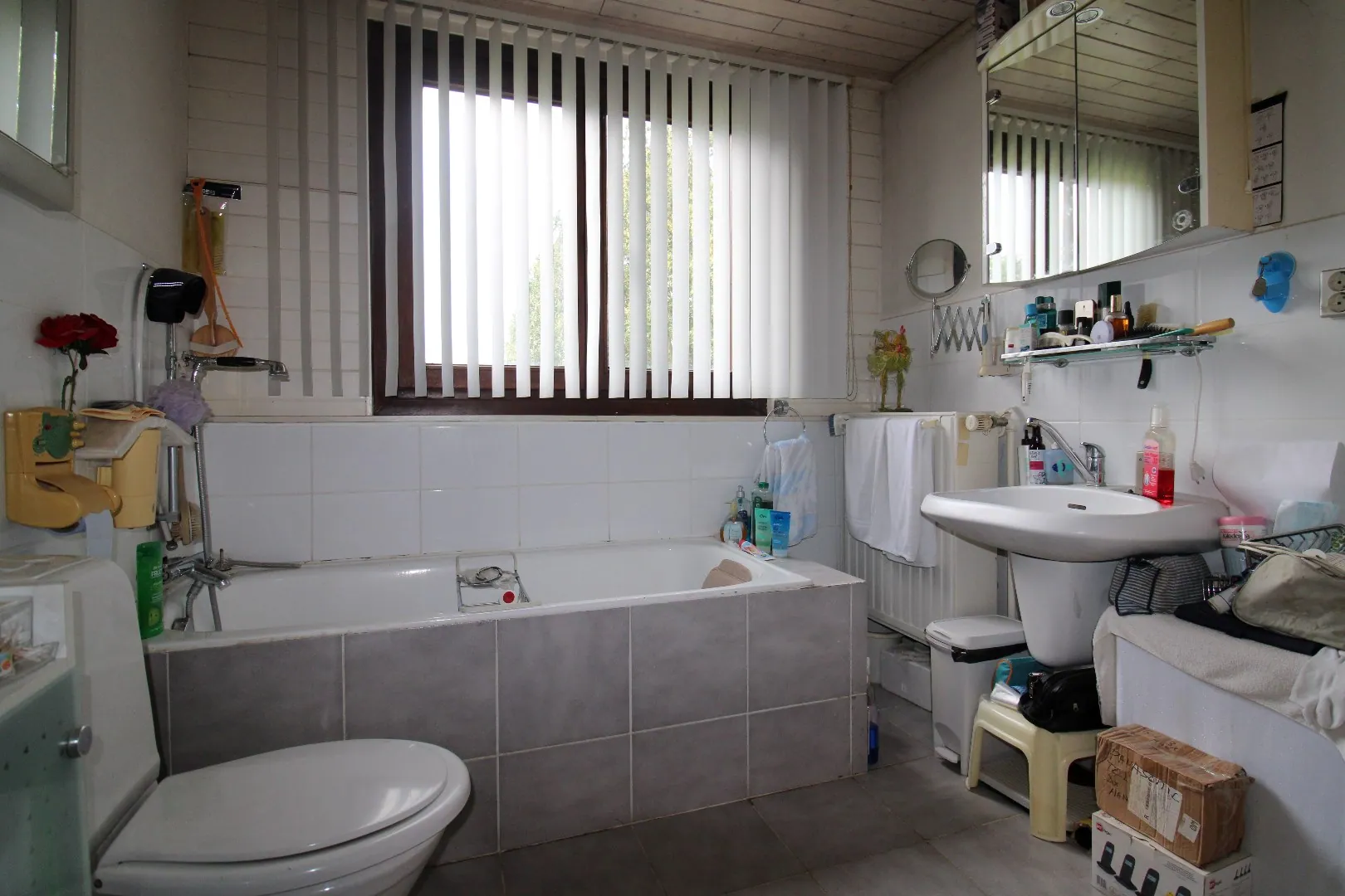 Op het gelijkvloers hebben we een aangename leefruimte met veel lichtinval en prachtige zichten naar de tegenoverliggende velden. Verder is er de keuken, wasplaats en inpandige garage.